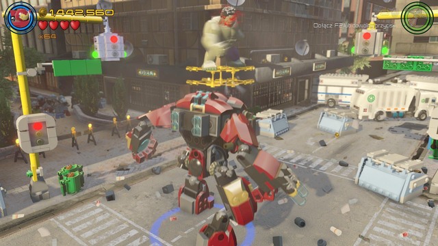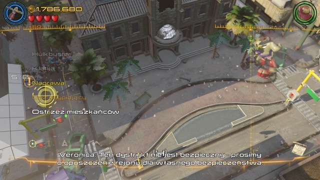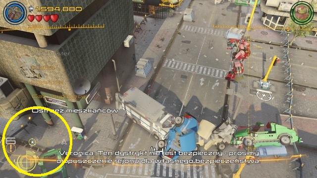 You will receive the last Minikit after warning six group of civilians that are looking at the event. In order to do it you must enter the satellite mode and select the warn civilians option from the left. Few groups can be warned when the battle with Hulk starts. Yellow circle marks a very badly visible group of civilians. Wait for the satellite to make a circle and point the crosshair in that corner to complete the task.
