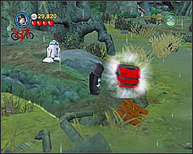 #3 | ![]() | To the right of Yoda's shack there's a red box that can be treated with the Dark Side. Once you change it into a raft, use it to get to the other side of the puddle. Use a detonator to blow up the shiny metal object there. |