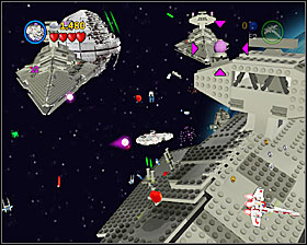 The next section takes place inside the Death Star. Gather torpedoes from the dispensers and use it to destroy the blockades and shield generators. Shoot all the time, destroying all the scaffolds and turrets for studs. When you're in the core room, destroy the panels on the walls. They open when you approach them - don't get too close, though, or you'll get electrocuted. When you destroy them all, the core's shield will go down. Shoot it a few times (you have to squeeze your lasers between the rotating metal barriers), and finally shoot a torpedo in it.