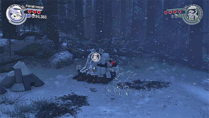 Location and how to unlock: You can obtain this red LEGO brick right after the last phase of the battle with Kylo Ren starts. Start in the spot where you have made the third snowman. Here, you find a snowball shown in the above screenshot. Interact with the snowball as a character that uses either the light or the dark side of the Force.