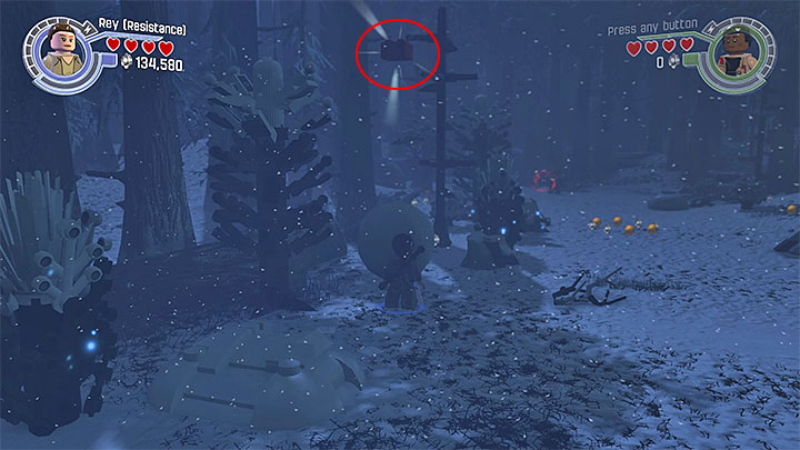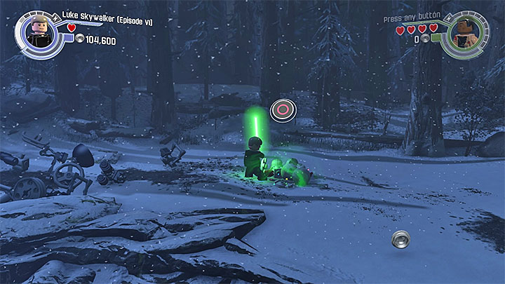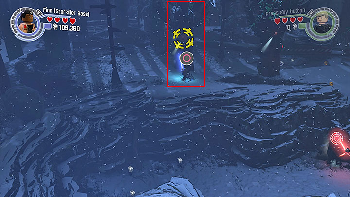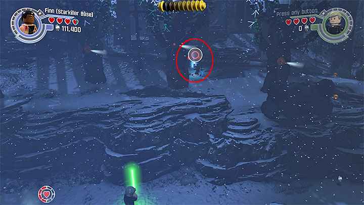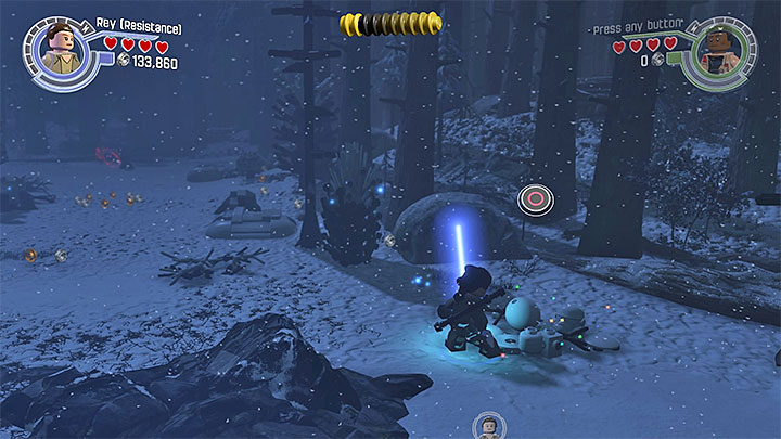 The snowball rolls to the left and, at the same time, grow larger. Go there and do not worry, if you inadvertently start the fight with Kylo Ren, because you do not have to go there. Start pushing off the snowball to obtain the red brick in mid-air.