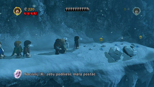 You will have to carry Gimli above the deep snow again. On the other side you need to follow the well-known pattern: enter the narrow tunnel with the Dwarf, destroy the cracked tile, head back above and break another LEGO piece. From the received elements you will be able to build a bridge which will take you to a rock ledge, where Gimli's axe will once again let you clear the further path.