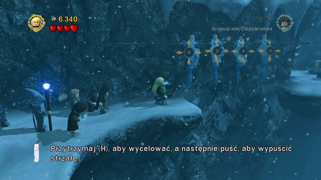 This is the last obstacle on the Pass. Legolas has to shoot an arrow into two targets, afterwards you have to build a cracked brick from the received elements and throw Gimli at it. Now cross the deep snow with any character to end this part of the level. The avalanche sent by Saruman will force our heroes to change their plans and head towards Moria.