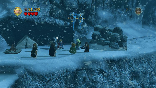 Right beside the rope there's a cracked brick. Pick up Gimli and throw him at it to open the path above. Once again pick him up, walk through the deep snow and enter the narrow tunnel. Destroy the cracked LEGO brick on the rock ledge to open the path for the rest of the team and also gain materials needed for the bonfire. Build and set fire to it with Sam's skill and the further path will become clear.