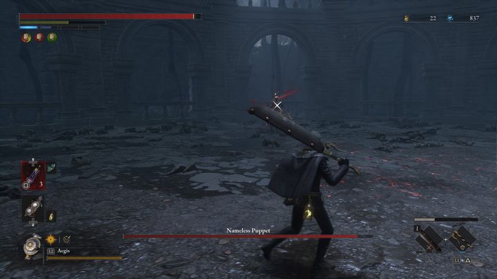 The Nameless Puppet often uses horizontal slashes in combat. What's more, it likes to attack two, three times in a row. This attacks are not that fast, so pay close attention to the moves of its sword. If the Nameless Puppet gets close to you, perform a dodge or a perfect block.