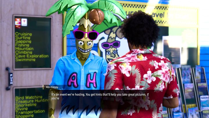 - When attempting to leave the travel agency, an NPC named Alo-Happy will talk to you and give you a leaflet related to Photo Rally. This begins Substory #32 - Tropical Photo Rally.