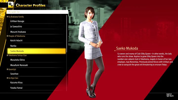 - Saeko is another character who was part of the main party in the seventh installment of the Yakuza series. In Infinite Wealth, she runs her own club, Silky Queen, and is a potential object of Ichiban's romantic interests. Saeko, like Nanba, can accompany both heroes. Initially, she will join Ichiban's party, and later she will join Kiryu's.