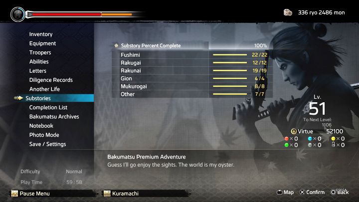- Mibu and others - These are all quests from the Other tab in the journal: Mibu, the farm and Kiyomizu Temple. There are 7 Substories to complete.