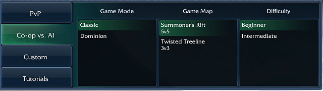 In this mode a team of 3 or 5 players fight against Bots (AI controlled champions). This can also be played solo or with others in one of 2 difficulty levels: beginner and intermediate. Participation in these games is awarded with less IP than the PvP games. This mode is recommended especially to beginners, so they could get familiar with the game's mechanics before they try their skill against other players. Moreover, at the very beginning playing Co-op vs. AI mode is the fastest way of getting experience, because the games are usually much shorter.