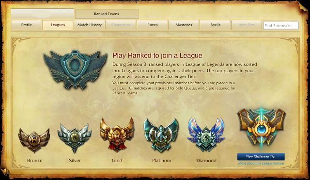 Here you can find information about your current league. To participate in league games, you need to reach profile level 30 and own at least 16 champions. If you meet these requirements, you will have to play 10 placement games, which will determine your skill and assign to a proper league. League games rules are described in earlier chapter, devoted to game modes.