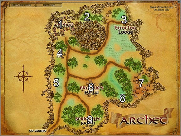 The two quests that remain to be finished now are the last ones in this chapter of the game, so you might want to go back to Archet to sell some stuff and finalize Pruner's quest. When you're ready, head for the bandit encampment (7). Watch out so you don't have to fight more than 1 enemy at a time (2, if you're feeling lucky). Some of them are armed with bows and have a wide range of sight, keep that in mind. The satchel is right in the middle of the camp. In order to get it, you'll need a few seconds without being attacked by anyone - that means you should deal with the surrounding bandits in advance. When you have the satchel and defeat at least 6 enemies, go back to Hunting Lodge. First finish Ann's quest, then Jon's. When you are ready, proceed with Jon's next request, which triggers the next instance.