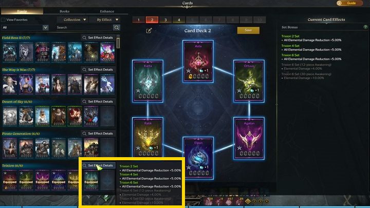 When you open the card tab (Alt C), you will see the cards collected into sets on the left. Hover over Set Effects Details to see what bonuses you can get by applying the indicated number of cards. There are 6 card slots available for you to choose from. More than one set can be active at the same time - this way, you can create and use, for example, two sets of 3 cards each. You can build several sets and use them depending on the situation.