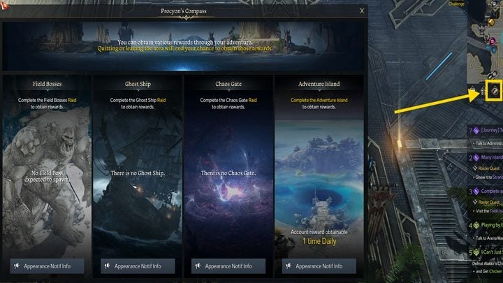 After starting the game and scheduling some playtime for the day you should check Procyon's Compass (the compass icon below the mini-map) to see what events are available. They rotate daily - one day you can fight Field Bosses, on another day you can visit special islands or Ghost Ships. Some of these tasks can be done once per day, others one per week - the compass window will tell you.
