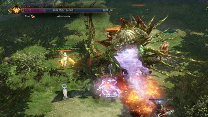 Rovlen is an easy opponent because he's basically a plant - and because of that, he doesn't move. He can heal himself slightly when he creates a barrier - in such case he creates tentacles around him, which you should destroy as soon as possible - he doesn't take any damage then. He also uses these tentacles to attack (you can see where by the red zones on the ground) and he can apply poison effects, so if you are low on health you should quickly retreat, as you can take additional poison damage.