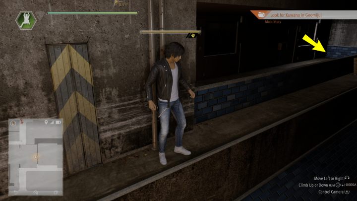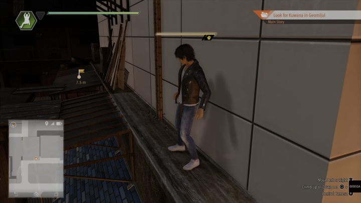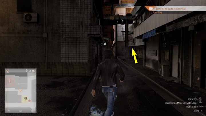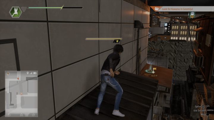 Head up the stairs and enter the Geomijul hideout. After the cutscene, slowly walk past the talking men, reach the stairs and head to the roof of the building.