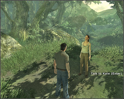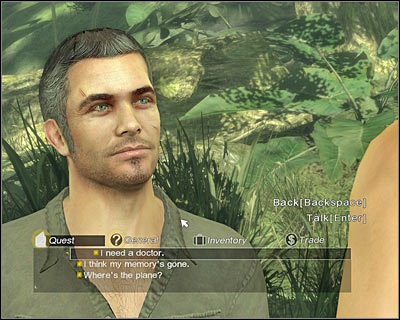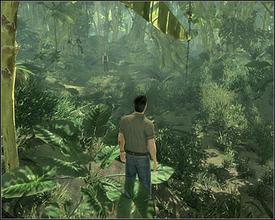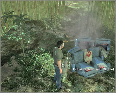 You will have to wait for the main character to regain consciousness. Once this is done, you should be able to notice that you're standing somewhere in the jungle. It would be a good idea to practice some of the basic moves here, including walking and examining objects. You can move by pressing the movements keys. Additionally, you can order your character to start running by holding the SHIFT key. You might want to consider examining a plane seat (screen). This can be done by pressing the SPACE key. Each time you will be given a short description of an object. I'll do my best to give you the exact locations of these types of objects later during the course of the game. Sadly, you won't be allowed to pick them up, so it's all optional.