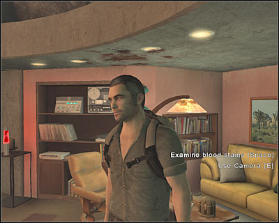 Your final task here will be to find some blood stains. Look at the screen if you're having some difficulties finding them on your own. Once again, you will have to use your camera here. Take a photo of the blood stains in order to fulfill yet another sub-mission. You may proceed to the bedroom area.