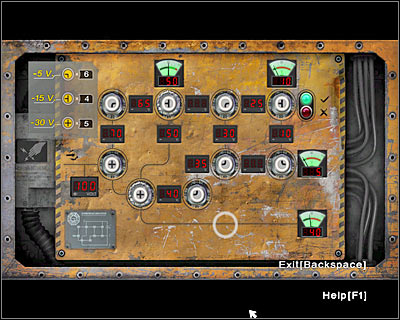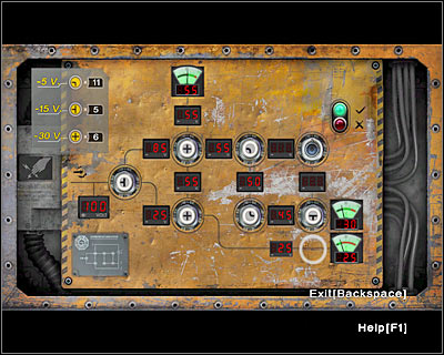 I think it's about time you should start thinking about getting out of here. Your main concern will be to lift the blast door, but this can only be done if you've used the main device. Your objective is to interact with three electrical panels. The first panel can be found near the bed. Approach it and press the ENTER key. Look at the screen if you're having problems placing the fuses on your own. I wouldn't recommend experimenting here, because you won't be allowed to pick up the fuses once you've completed this mini-game. If you've done everything correctly, you should notice that the first green lamp has lit up.