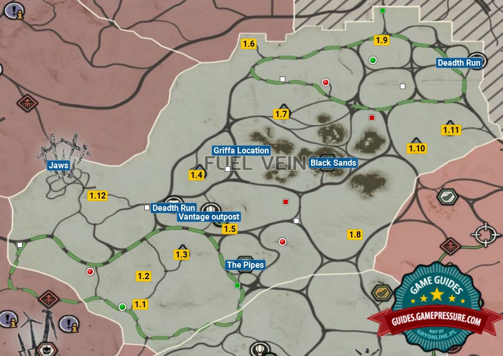 The Pipes (10x Scrap, 4x Insignia, 1x History relic) - two snipers can be found before the entrance to the camp, and the gate is protected with flames. Inside you will find two groups, in both cases a War Crier is hanging above the arena. Behind the door opened with explosives you will find a bridge, on the other side a single opponent and slightly below a History relic. At the bottom there's a large group of enemies. New enemies will keep coming at you. There are two pumps to destroy there.