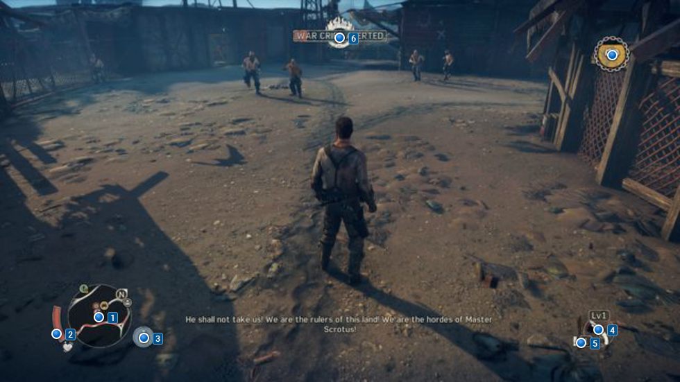 No matter whether you are traveling on foot or in a vehicle, the interface in Mad Max is very simple and clear. In both cases, in the bottom left corner of the screen you will find information about Max's health ([2]) and the canteen with water ([3]). You can increase the size of the bar by buying an upgrade at Griffe. On the other side you will find information about the selected weapon ([4]), ammunition ([5]) and car's durability and fuel (visible only when you're inside the vehicle). During battle you will also fill a fury bar ([7]) which allows you to deal more damage and use stronger hits.