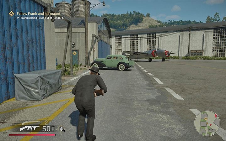 The FBI car will reach Lost Heaven Airport. Upon receiving the new mission objective, hide the car in the bushes on the left side of the main road that is leading to the airport grounds.