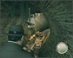 Head towards the river, turn around and find a metal gate #1. Approach the gate and wait until Vito opens this passageway. Head forward once you're in the sewers. Make a stop near a hole in the tunnel #2 and wait until the dog stops barking