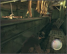 Make sure that you're crouching and quickly take cover behind the counter #1. Notice that an armed opponent arrived here are there are also two slaughterhouse workers in this room. Start moving right #2 while staying close to cover.