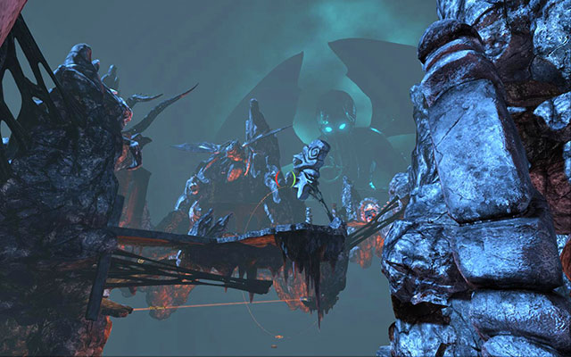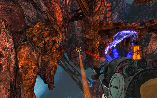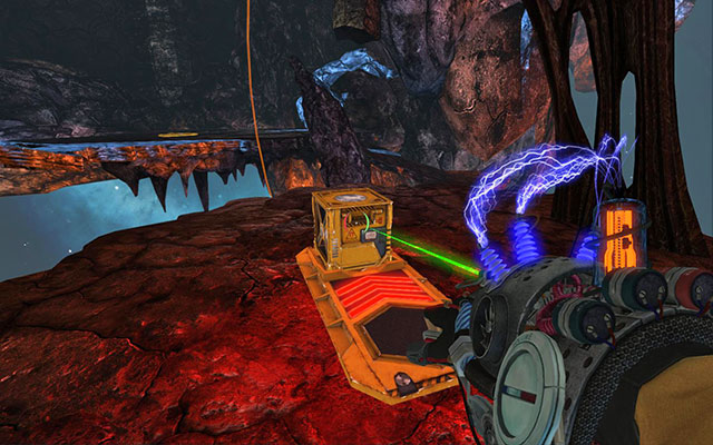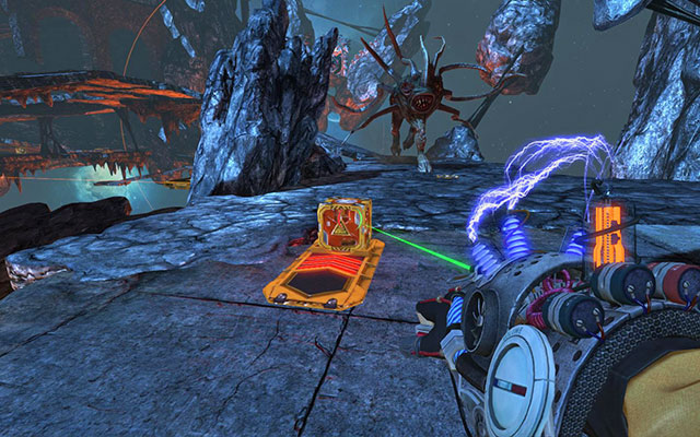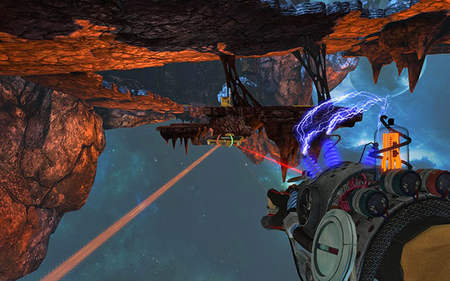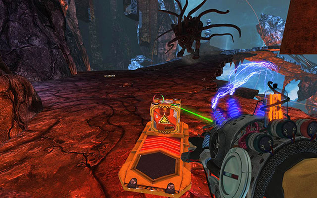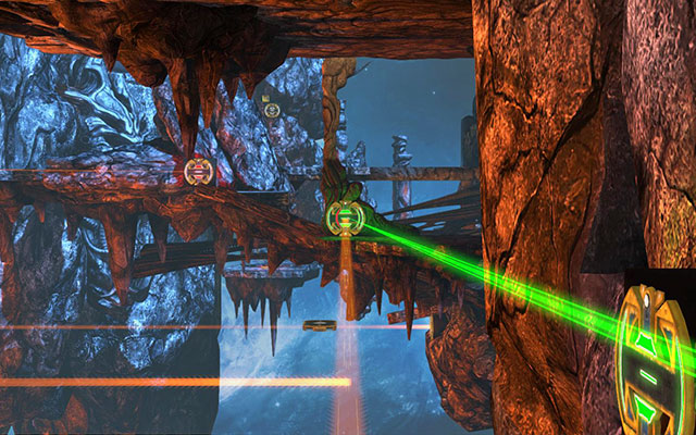 Unfortunately, you need four such blows to eliminate the beast - and enemy destroys every used launcher. So, jump on the rock on left and approach horizontal platform. Change module to red, jump on it and use green charge.