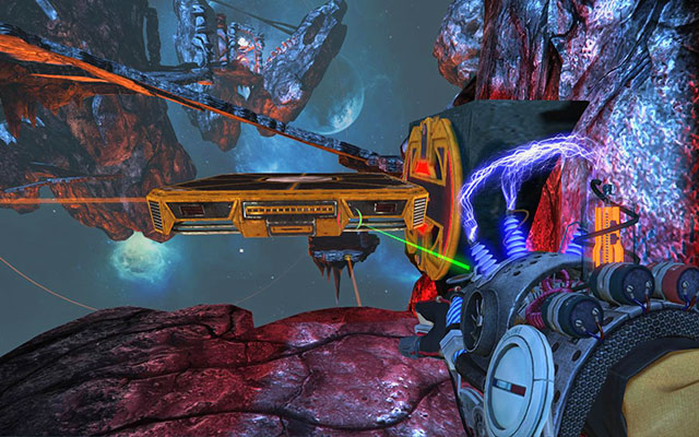 Jump on the riding platform and look right. Fire at the module with red charge.
