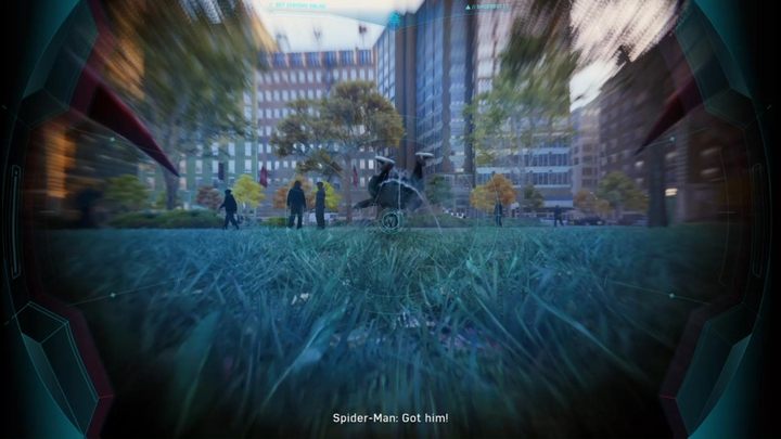 You take control of the spider-bot. Your task is to go to the next fume outflows - your gadget will automatically eliminate toxins. Watch out for people and traffic - go to the next poison points. Finally, you will reach a group of people, get close to them and scare them. Chase your opponent now - target him and shoot him with R1. When you get near the bandit, you will control Peter again. Take the spider and return to the station, and the mission will end.