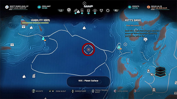 This quest becomes available after Eos has been terraformed. This means that you can now explore the west part of the map without the danger in the form of deadly radiation. You should receive a message through radio from Bain Massani. After that the marker, presented in the picture above, should appear on your map. Bain wants to meet with you and talk about weakening the Kett on Eos.