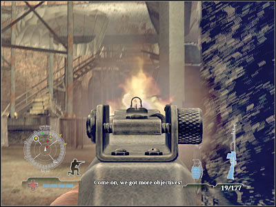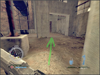 Before a guy with the armor arrives here, try leaning out and killing a few of the standard enemy units. I would recommend choosing longer bursts, instead of single shots. You won't have to worry about ammo supplies. Use your compass frequently, so no one manages to surprise you. Try killing at least 3-4 enemy soldiers from here.