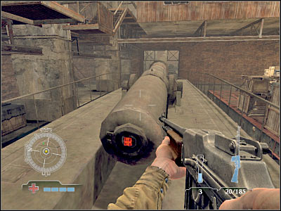 You will have to approach the railgun from the western side, because that's where you'll find a well known glowing icon. Go there now. Press the action key, so you'll be able to place an explosive charge on the railgun. Move back and wait for an explosion to occur.