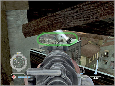 Once you're safely inside the tower, you will have to choose a standard rifle (not the machine gun) from your inventory. There's going to be a small hole to your right. You can see the top of the town hall building from here. Go ahead and kill a few enemy soldiers. They should be helpless against your attacks. You won't have to kill all of them right away. The objective is to make your next fights easier.