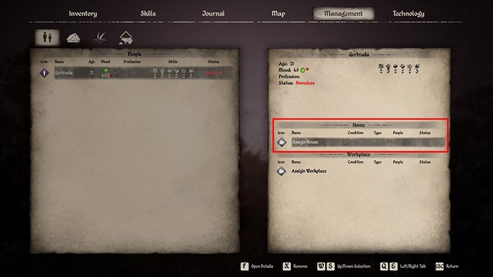 Select the "management" tab. The new village residents will currently be listed as "homeless". Select a person's name and press the "F" key to view their details.