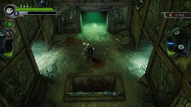 In the beginning of the level, fall down and keep defeating all foes until a trapdoor opens. Jump into the hole and defeat another wave of enemies. This time they will be accompanied by two cannons that will shoot at you, so don't stay in one place. Fire Arrow (the weapon obtained from the Centaur in the Hall of Heroes) is very effective against these enemies. You charge this weapon with circle and then shoot an explosive arrow that will burn everyone around the explosion. Once you kill everyone, a door to the next room will open. There, you must fight zombie madmen, bats, and headless zombies. Once you defeat everyone, don't jump into the hole. Instead, collect the Silver Shield and the treasures that will fall after you defeat the wave.