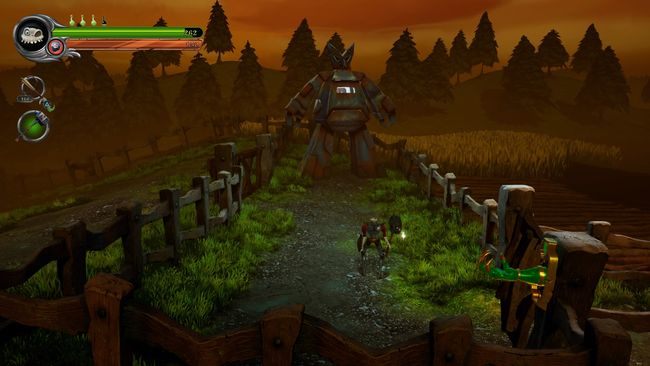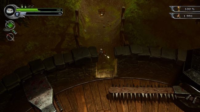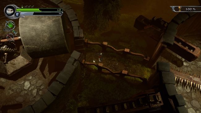 You will see a book to read in front of you immediately when you start the level. It will give you a clue how to fight the scarecrows. They are unusual opponents that can be quite irritating. Use R1 button to hit them with a shield and make them lose balance. Use the triangle button to kick the cart and make a way. Kill the crazy villagers. Then, collect the vials and gold from this area. Equip the Mace and go to the fireplace. Set it on fire and quickly run to the haystacks from which the villagers were coming. Set the haystacks on fire. Gold will drop from one of the haystacks. You should visit the Merchant Gargoyle and buy some crossbow bolts. Once you clear the area, move behind the fence and fight the machine controlled by the imp. The battle is quite simple. Keep shooting the head of the machine until it drops off. Then, move between the legs of the machine to its back and shoot the imp. You should destroy the machine in a few moments. Once you defeat the machine, pick up the Moon Rune and use it to open the door to the cabin in the previous location. Read the book next to the door. Walk inside and get rid of the bats (crossbow is very effective). Collect the Earth Rune and the Club from the chest. With this rune, you can open the passage in the place where you fought the machine.