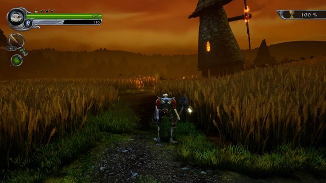 Carefully pass through the "wings" of the windmill and kill the final cursed scarecrow in MediEvil. Now you must complete a short, action-based sequence. Pass by the rolling grinding wheel (touching it will kill you), then pass through the spiky propeller while avoiding the wooden barricades. If you can't dodge this trap - block it with the shield. Charge your health in the fountain and face another trap. When facing another grinding wheel, jump and quickly move to the left. The penultimate trap is simple. Just wait patiently and jump over the low fences in such way that the spikes won't hit you. The last trap has a hidden SECRET. Walk inside and pass through the trap by jumping or blocking. At the end of the trap you will find a niche with a Harvester Part and a gold chest. Now you have to go back to the barn! Use the Harvester Part on the machine. The harvester will cut a path through the field. The path will take you to the Chalice, a health potion, a health fountain, and plenty of gold. Now go back. Near the final trap you will find the end of the level. Talk to the gargoyle and leave the level.