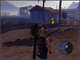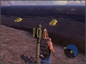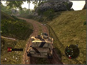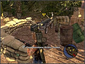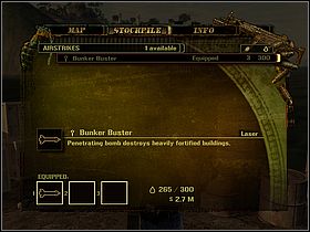 Make sure that you are in possess of at least 300 units of fuel. If you aren't you have to steal it from the base. To do this, clean up the area very carefully. Inside, you will find another tank which you can borrow. Get nearby the shelter (marked by yellow symbol). To be able to use bombs open your PDA and choose type of a weapon which will go to your handy menu [#050].