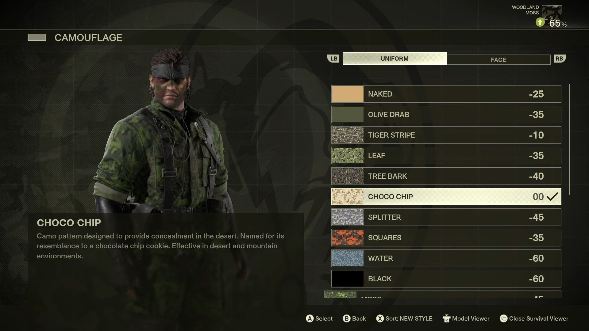 Uniforms serve as your primary means of camouflage. You can freely change your uniform to blend in with your surroundings - the higher your camo index, the more difficult you are to spot. Some uniforms also have special features, described in orange text in the camouflage menu.