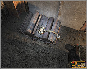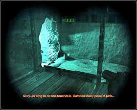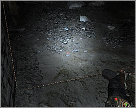 Choose the only available passageway #1 and notice that there are A LOT of traps in the area. Avoid touching the cans and stepping on the broken glass. You'll also have to avoid a trap triggered by a rope #2. I would recommend using nightvision goggles here, because a flashlight could alarm nearby hostiles.
