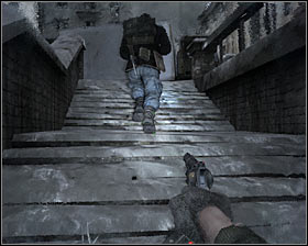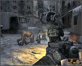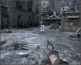 Make sure to choose a good weapon from your inventory, because you're about to be attacked by a large group of monsters #1. Don't forget to attack the monsters from a larger distance, use medical supplies when needed and prevent the beasts from surrounding Artyom. Wait for Bourbon to give a retreat command and follow him to a new building #2 where you'll be rewarded with a new cut-scene.