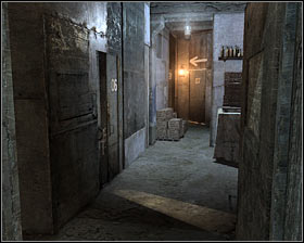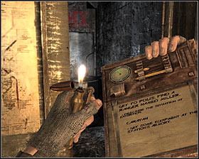 Your next area of interest should be the armory and you must choose a passageway with a gun sign located above it #1. It should only take a few seconds to find the armory #2. Remain here, because you'll receive several important items for free, including a submachine gun with ammunition, a charger for your flashlight (you must hold the F key to choose it from the inventory), a brand new gas mask with filters and several medkits. You can now test your new gun on a nearby shooting range or leave the armory right away.