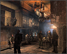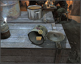 I would recommend that you take your time by talking to a man sitting on one of the benches #1. You can comply to his wish and spare two rounds of gold ammunition for his son (press the action key). Check the items being sold in two nearby shops #2 while you're here.