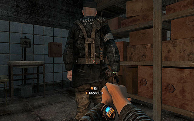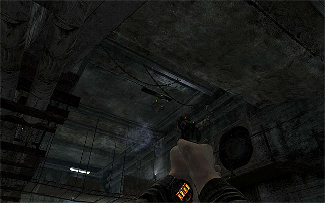 Return to the main tunnel and now focus on the previously mentioned guard patrolling upper balconies. Theoretically you could climb one of ladder leading there and deal with him personally but it is better to destroy a lamp hanging from the ceiling and wait until Pavel eliminated this guard.