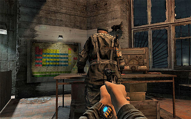Move ahead. Starting from this point it would be good to neutralize all light sources along your way, thus increasing the effectiveness of remaining hidden. Unscrew the light bulb in the right lamp and then use the silenced revolver to destroy a reflector visible in a distance. Watch out for the guard heading there. You do not have to personally deal with him, because Pavel will eliminate him. You might of course examine the body, because in addition to standard supplies the guard has with him a machine gun.