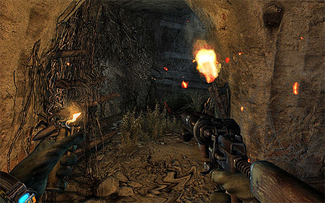 Carefully, enter the cave, which will start another battle. Apart from the kind of mutants that you have already seen, there will be different ones that walk along walls and attack you at a distance. To the extent to which it is possible, try to run up to this kind of the monsters and eliminate them with your shotgun, or any other short-range weapon, as they are not very tough.