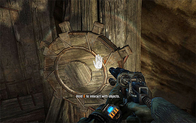 Once the battle is over, look around for corpses with supplies and approach the blocked passage again. You need to interact with the rotary mechanism shown in the above screenshot. You couldn't do it before the mutant attack, as opening it requires holding the correct key for a longer period of time. Do not release the key until the gate opens completely.