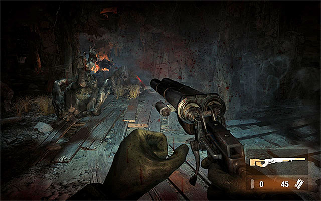 After you succeed, explore the area to find, among others a double-barreled shotgun with four barrels instead of two (a similar modification can be purchased from dealers so, it is not an absolute novelty). Find a spot in which you can jump down to a lower level and get rid of yet one more group of monsters. It is a good idea to put up fight in the place where you landed after the jump and help yourself with grenades, because there is only one narrow path that leads to this spot.