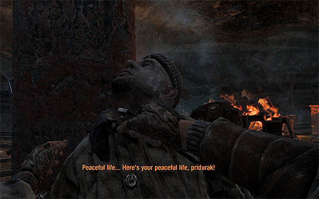 Return to the main tunnel now and carefully approach the area with two flaming railway cars, where there is a larger group of bandits. I recommend that you start by smashing the lamp to the left and eliminating the bandit with the petrol can.